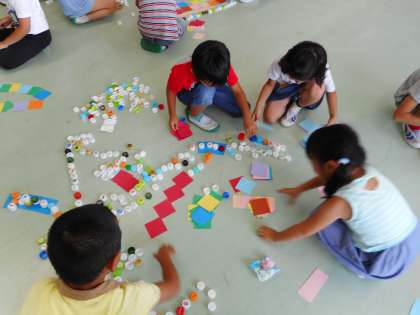 色画用紙とペットボトルキャップを思い思いに並べ、いろいろな模様や形を作り出しました。友達と協力した作品作りに夢中になって取り組んだ子ども達です。
