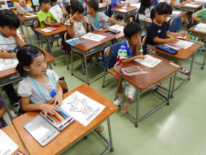 最後は、カラーモンスターを作りました。アニーク先生が〈色+パーツ〉を英語で話すのを聞き取って、色鉛筆でモンスターの体を塗りました。どんなモンスターが誕生したかな。