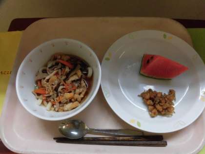 ☆今日は1学期最後の給食になります。献立の『冷やしうどん』の汁は、沢山のかつお節を使用し、だしをとっています。だしの風味を子ども達に味わっていただきました。