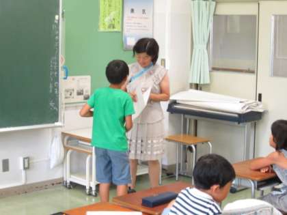 1学期がんばった成果をまとめた通知表「あゆみ」を受け取りました。一人一人、先生からどんなことを頑張ってよかったか、話してもらいました。頑張った自分をほめる時間です。家でもたくさんほめてください。
