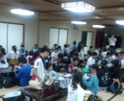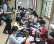 ダイヤ公園に着いたら雨が降ってきました。残念。公園で遊んで昼食の予定でしたが、宿舎に行って、そこで昼食をとることにしました。11時40分、宿舎の大広間で「いただきます」。雨の心配もなく、ゆっくり食べることができました。