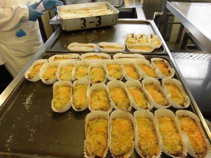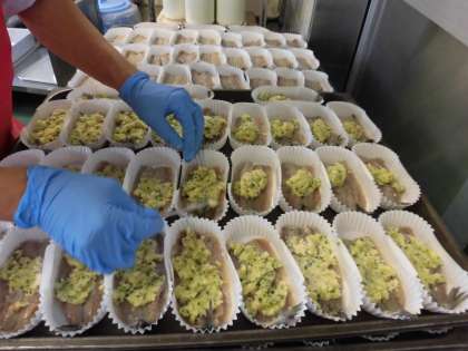 ☆今日の献立は『いわしのガーリック焼き』です。カップに下味をした生いわしを入れて、パン粉・マヨネーズ・白ワイン・にんにく・パセリを合わせたものを、いわしの上にのせて、オーブンでこんがりと焼きました。ガーリックの香りが給食室からしていて、食欲が増す1品です!