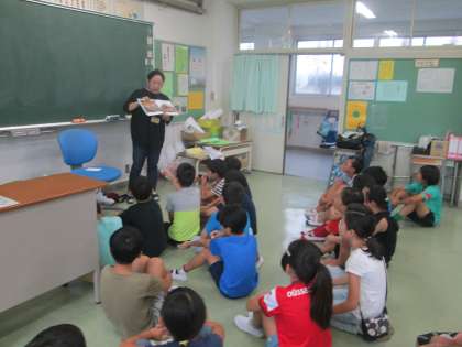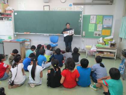 「すごいね!みんなの通学路」という本を読んでいただきました。日本以外の国の通学の様子がよく分かる本でした。子どもたちは、写真を見るたびに驚いていました。また、クイズを出していただき、楽しく本に触れることができました。子どもたちも、自分たちが恵まれていることに気が付いたことと思います。