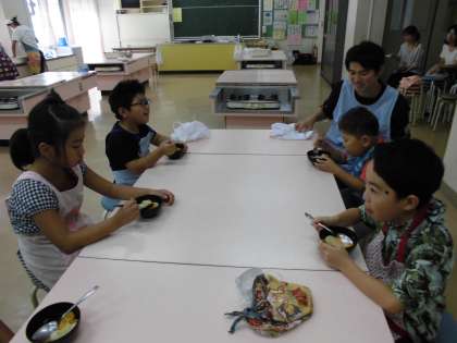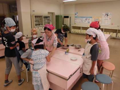 本日8日(土)3・4校時、生活単元学習で「フルーツ白玉」を作りました。昨日、事前学習を行い、準備する物、手順を学習していたので、身支度を調えると家庭科室に集まり、調理に取りかかりました。白玉粉と絹ごし豆腐を交ぜて作った、柔らかい生地を丸めてだんごを作りました。出来上がると早速試食すると「おいしい。」「家でも作ってみたい。」という声がたくさん聞こえました。