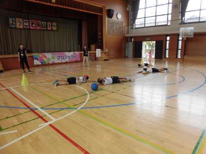 ゴールボールの選手である信沢用秀さんの指導のもと、ボールを投げる止めるの基礎練習、実際にアイシェードをつけて何も見えない状態でゴールボールの試合を行いました。ボールの中に入っている鈴の音をたよりにボールを止めようとするのですが、音だけをたよりにボールの位置を判断するのは難しいようでした。