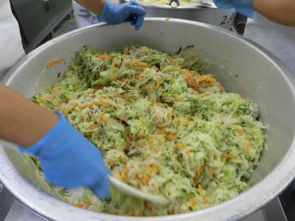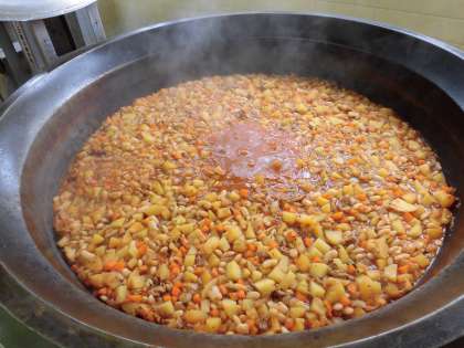 ☆今日の献立は『ポークビーンズ』です。ポークビーンズはアメリカの家庭料理の1つとも言われていて、豆と豚肉をトマト味で煮込んだものをいいます。給食室の大釜でたくさん作りました。
