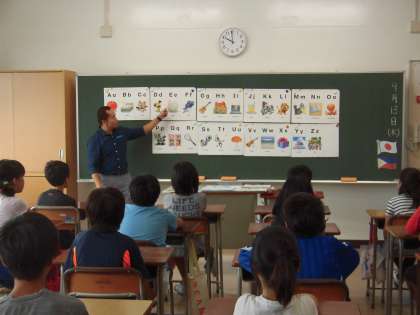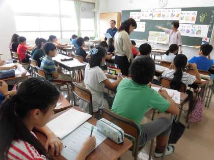 中学校の教室で、中学校の先生が教えてくれる英語の授業ということで、はじめは緊張していた子どもたちでしたが、自己紹介や歌、ゲームを通して楽しく学習することができました。