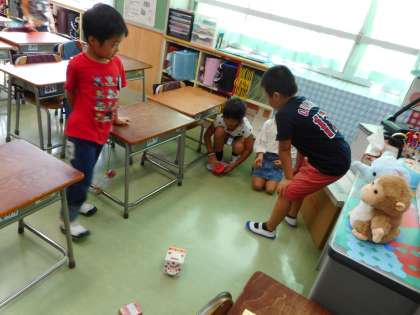 2組は昨日と今日で、「ころがし選手権」「つむつむ選手権」を行いました。