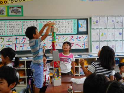 また、高く積み上げるためにはどのように箱を積んでいけばいいのか、つむつむ選手権で体験しました。「しかく」「さんかく」といった形だけでなく、平らなところ、まるまっているところと、面の様子に着目した子が多く、いい意見がたくさん出ました。