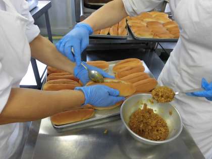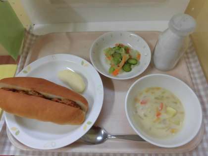 ☆今日の給食は『ドライカレーサンド』です。子ども達の「ドライカレーサンド」約600個を作るために朝早くから、調理員の方が心を込めてパンの中にドライカレーを詰めて下さいました。ドライカレーのかくし味にレーズンが入っています!