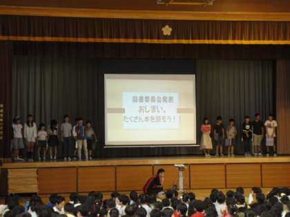 本日20日、図書委員会による児童集会を行いました。始めに、読書旬間中に取り組んでいることについて紹介をしました。続いて「いろいろこねこ」の本の読み聞かせをしました。この読み聞かせをした内容についてのクイズを出し、みんなに答えてもらいました。そのほか色の出てくる本の紹介をし、読んでみてくださいと呼びかけをしました。