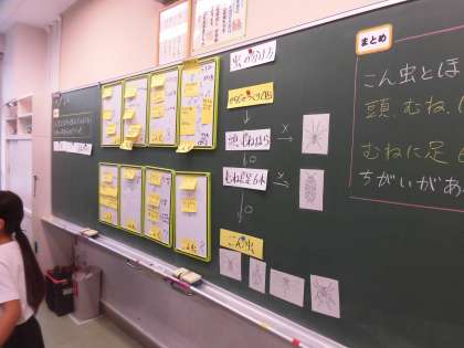 また、子どもたちは分類した結果からグループでフローチャートを作成し、昆虫のからだには「頭・胸・腹の3つに分かれている」「胸に脚が6本ついている」ことを確認しました。フローチャート作成というプログラミング的思考を生かした学習を通して、昆虫のからだの特徴を確かめ、理解を深めていくことができました。