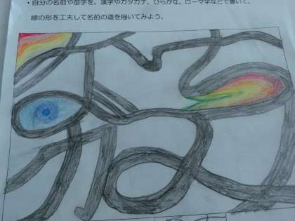 5年生は、自分の名前や苗字を漢字やカタカナ、ひらがな、ローマ字などで書いてみて、線の形を工夫して名前の道を描きました。いろいろな文字でアイディアスケッチをしたり、色鉛筆でグラデーションを使って塗ってみたりしました。