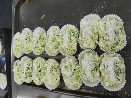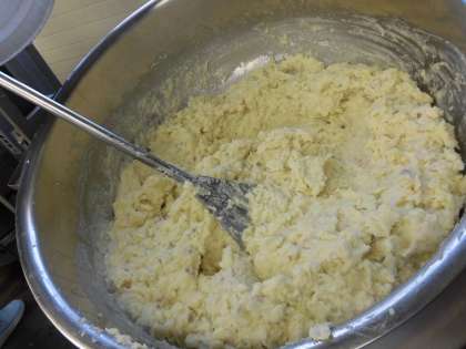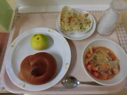☆今日の給食は『ポテトクリーム焼き』です。たくさんのじゃが芋を切って、大きいマッシャーでつぶしました。そこに味付けをして、カップ1つ1つにマッシュしたポテトを入れていきました。チーズとパン粉をかけて、オーブンで焦げ目がつくまで焼いて完成です!