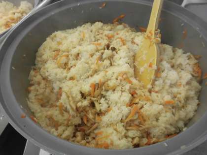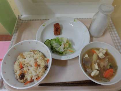 ☆今日の給食は秋の味覚『きのこごはん』です。今が旬のしめじ・えのきが入っています。給食室の水飯器で調理員さん達が上手に炊いてくださいました!!