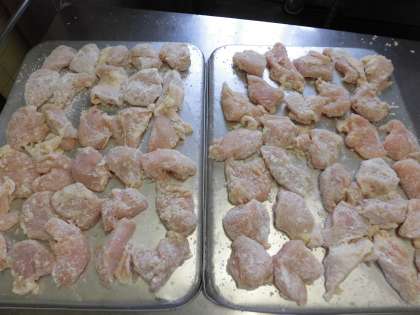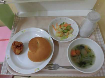 ☆今日の給食はみんなの好きな『鶏肉のレモンソースがけ』です。鶏肉に下味をつけ片栗粉をまぶし給食室の大釜でカリっと揚げました。レモンソースはしょうゆ・砂糖・レモン汁を煮詰めたものを揚げた鶏肉にかけました。酸味も少なく食べやすい味になっています!!