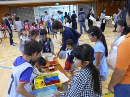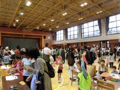児童が主体となって、様々なお店を開店しました。体育館では、1年生と2年生が工作のコーナーを、3年生以上の学年は、校舎内で迷路や劇、授業で学習したことを生かしながら行いました。2年生は1年生に優しく作り方を教えたり、リーダーになって、お店を盛り上げたりしていました。作りに来たお客さんにも分かりやすく教えていました。校舎内では、看板を持って、一生懸命宣伝している姿もありました。遊びに来た方々が楽しんでいました。烏山小学校の児童一人ひとりが輝いていました。来年のキッズフェスティバルも、児童全員が輝けるようにしていきます。