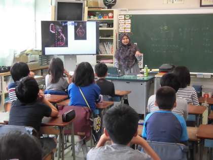 授業では、民族衣装に身を包んだ講師の方から、それぞれの国の特徴となる、地域、気候、言語、民族、食べ物等について、映像と共にお話を聞くことができました。