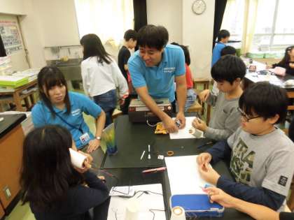 この日の5、6校時に1組で理科「電流のはたらき」の学習が行われました。校内研究で取り組んでいるSTEM学習の一つである「ものづくり」をクローズアップした授業実践。子どもたちは電磁石のはたらきを使って、よりよい音のするスピーカー作りに取り組みました。
