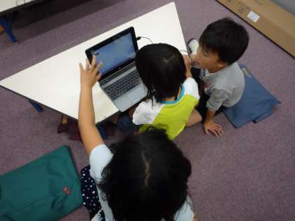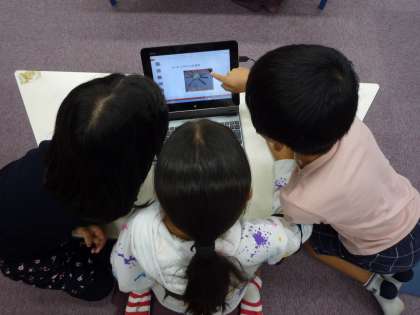3年生では、タブレット型端末のプレゼンテーションソフトを使用して、アニメーション作成を行っています。写真はパソコン室での様子です。どの写真を使用すればいいか、3〜4人のグループで話し合いながら協働的に学習をすすめています。