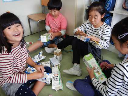 今日は、紙パックをはさみで細く長く切りひらいたものを、ひねったりホチキスやテープを使い形を変えて作品を作りました。紙パックを途中で切り落としてしまわないように気を付けたり、お友達と協力して作品をつなげてみたり…様々な工夫をしました。