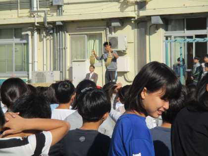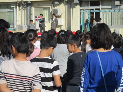 本日の全校朝会では、校長先生より、オリンピック・パラリンピック教育の一つとして「ドミニカ共和国」についてのお話がありました。国旗を紹介しながら、面積・人口などについて教えてくださり、「メレンゲ」という音楽で陽気に踊る国民であるということをお話いただきました。続いて、烏山区民センターの文化祭に作品が出された人の表彰がありました。