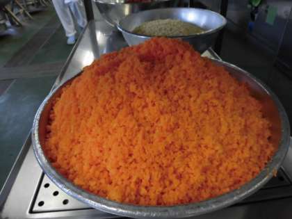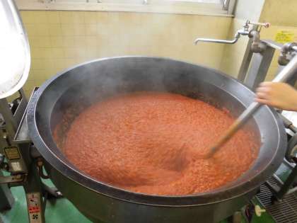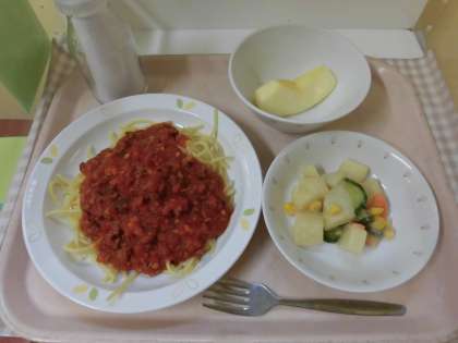 ☆今日の給食は子ども達の大好きな『スパゲティーミートソース』です。ミートソースも手作りで、約100個の玉葱・大豆・人参・ピーマンが入っています。調理員の皆さんが、みじん切りにし、調味料を入れ大釜でじっくりと煮込みました。スパゲティーにソースをかけていただきます!