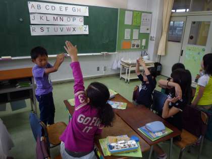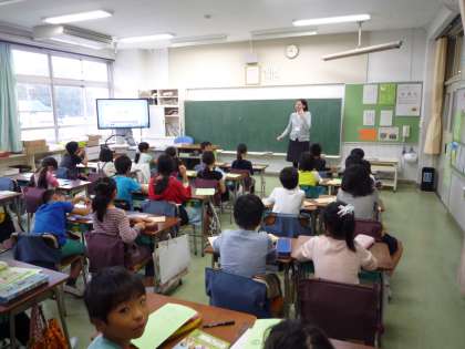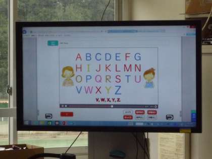 外国語活動では、アニーク先生と一緒にアルファベットについて学習しています。