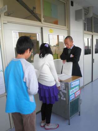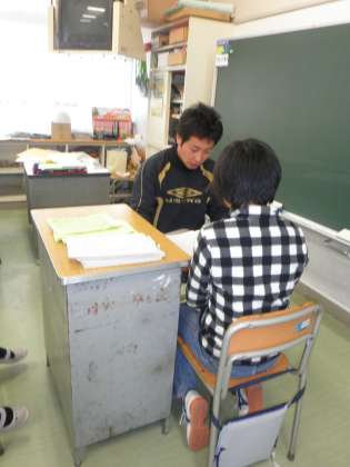 5年生はどのクラスも廊下に出て通知表を渡しています。6年生では、教室で、机を置いて通知表について話していました。それぞれの先生が、子どもたちとしっくりと話をしています。