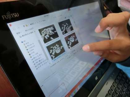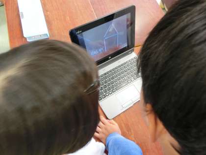 3年生は、タブレット型パソコンで撮影した画像を、編集ソフトを使ってつなげていく作業に挑戦しました。100枚近くある画像を並べ替えたり、タイトル画面のデザインを考えたり、あれこれ試しながら作品の内容に合わせた色や動きを選んでいました。