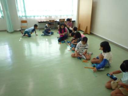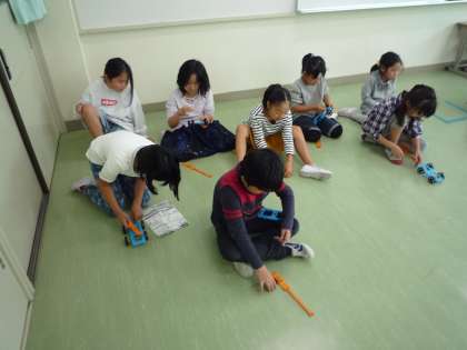 多目的室で、ゴムの力で車を動かしました。