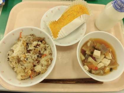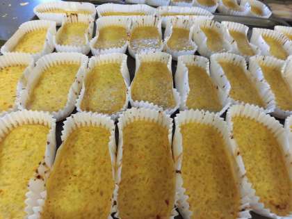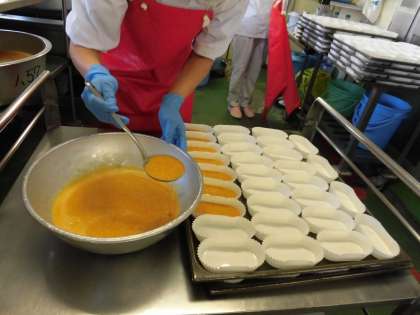 ☆今日の給食は『卵焼き』です。野菜がたくさん入っていて栄養バランスがとてもよい1品です。1つ1つカップに入れてオーブンで焼きました。