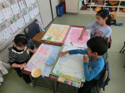 この学習では筆は使わず、自分の手や指で紙に絵を描きます。液体粘土を初めて見た子どもたちは「ボンドみたい。」と言っていました。