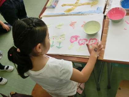 活動が始まるとドロドロした感覚に「キャー」と歓声があがりました。手のひら全体でペタペタ押すように描く子、手のひらで色を混ぜ合わせて描く子、どの子も楽しんで取り組むことができました。