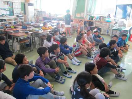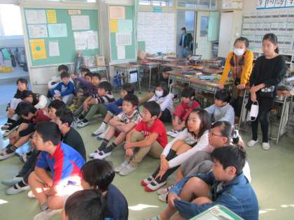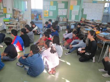 「銭天堂」という本の中に入っている「兄弟だんご」を読んでいただきました。話を聞いている子どもたちは、静かに集中して聞いていました。中には、自分の日常生活に重ねて聞いている子どもたちもいました。いろいろな話に、興味をもって読んでほしいと思います。