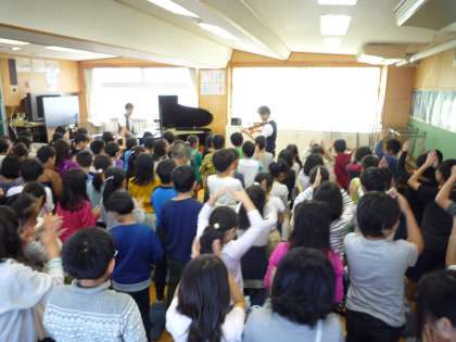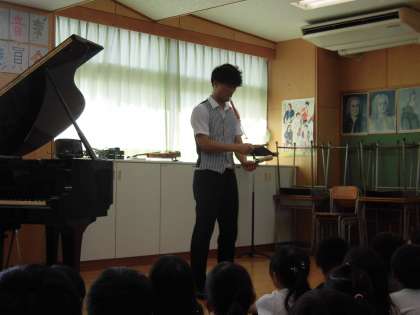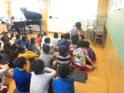 11/10(土)に1年生から4年生を対象としてエバリーによるコンサートが音楽室で開かれました。今回で3年目になるので、音楽室にあるポスターを見てみんな楽しみにしていました。音楽室にひとつの学年が集まるので少々せまかったのですが、その分、間近で生の楽器の音を味わえたと思います。モーツァルトの「トルコ行進曲」から始まり、おなじみの「テキーラ」では元気よくこぶしをあげて「テキーラ」と声を出し、楽しいひとときでした。保護者のみなさまにもたくさん参観していただきました。ありがとうございました。