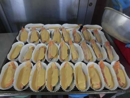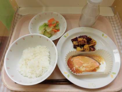 ☆今日の給食は『鮭のみそマヨネーズ焼き』です。鮭は秋鮭を使用しています。秋鮭は高タンパク質 低脂肪で ビタミンA ビタミンB1 ビタミンDが多く含まれて栄養がとても高い魚です。今日はカップに鮭を入れて味噌マヨネーズをかけてオーブンで焼きました。
