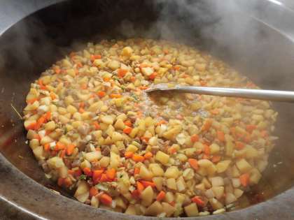 ☆今日の献立は『豚肉と大根のうま煮』です。今が旬の大根を使用しました。厳しい寒さに耐えて育った大根は甘味とうま味が凝縮されています。今日も給食室の大釜でじっくり煮込んで、豚肉と大根のうま煮が完成です!!