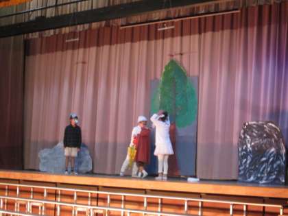 お化けの森に住んでいるお化けたちが、パーティーに出かけます。その途中で、いろいろな事件が起こります。お化けたちは助け合ってパーティー会場に向かいます。パーティー会場でみんなで楽しく踊りました。子供たちが劇遊びを通して作り上げ、楽しい劇に仕上がりました。