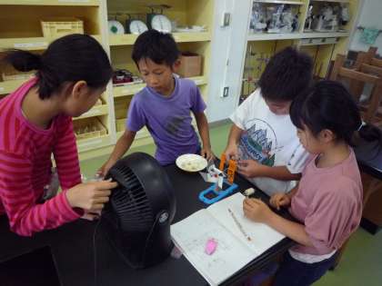風のはたらきでは、サーキュレーター(送風機)を使って、風が強いときと弱いときでどのような違いがあるか調べます。