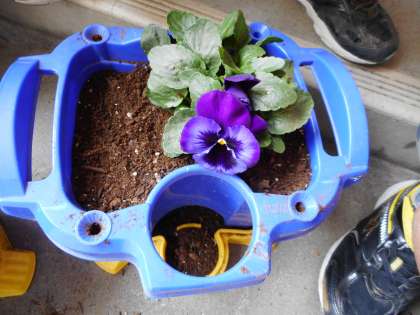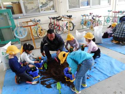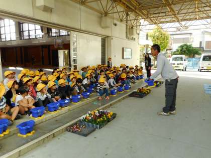 アサガオの鉢に、パンジーの苗とチューリップの球根を植えました。アサガオとは違い、水をやりすぎてはいけないこと、上手に育てると2年生になるころまでパンジーの花が咲き続けることを教えていただきました。「チューリップはいつ咲くの?」と、まだ芽もでていないのに楽しみにしている子どもたちです。