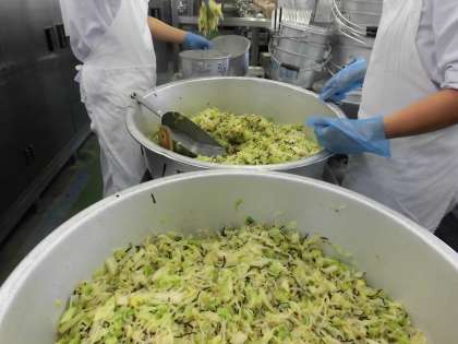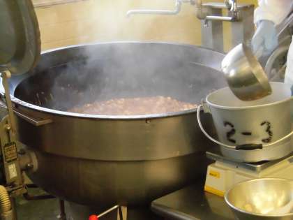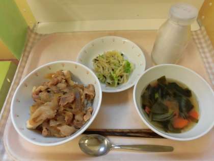 ☆今日の給食は、みんなの好きな『豚丼』です。豚肉にはビタミンB1が多く含まれていて、疲労回復や風邪予防に役立つビタミンです。今日も給食室の大釜でたくさん作りました。