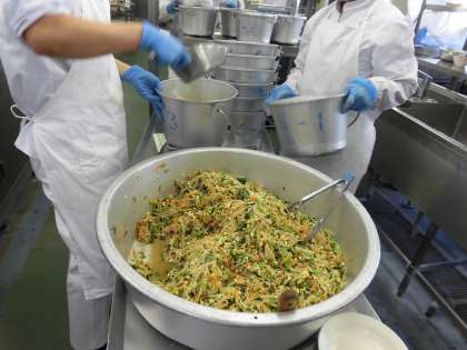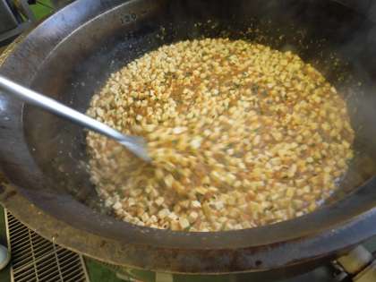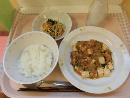 ☆今日の給食は『麻婆豆腐』です。給食の麻婆豆腐には、いろいろな食べものが入っています。「人参 たけのこ 干し椎茸 にんにく しょうが ぶたひき肉 長葱 たけのこ 豆腐 にら」10種類の具だくさんの麻婆豆腐です。栄養バランスも良く今日も給食室の大釜でたくさん作りました!!
