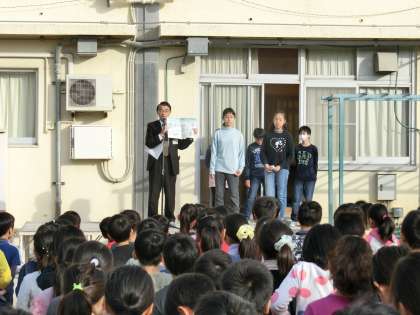 表彰では、「はたらく消防の写生会」「烏山プラネッツ」「税に関する絵はがきコンクール」など、いろいろな場面で活躍した児童が表彰されました。