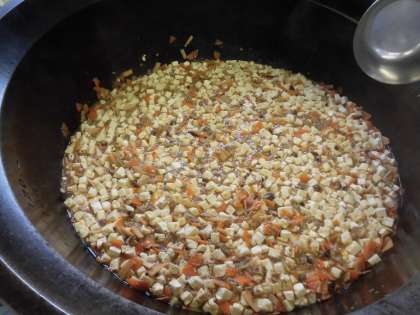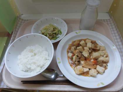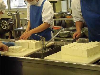 ☆今日の給食は『家常豆腐』(ジャージャンドウフ)です。家常豆腐とは中国四川省の家庭料理です。漢字では「家と日常の常」でジャージャンと書きます。ジャージャンとは家庭風とか家にありふれたという意味があり、家で常に食べる豆腐料理ということから、この名前がついたと言われています。今日も給食室でたくさんの豆腐を切り大釜で作りました。