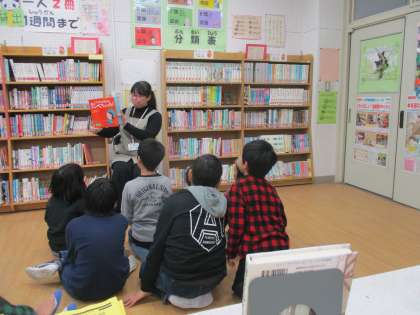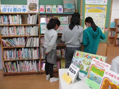 本日12日は、雨天のため図書館への来館者が多い一日でした。現在、新しく入った本の見本が展示されているため、新着本を見ている子どもが多くいました。また、図書館の入り口には、クリスマスが近いので、図書版アドベントカレンダーが貼られています。子どもたちは、興味をもってカードを見ていました。読み聞かせを行っていた学級もあり、本日も図書館では、様々な活動が行われていました。来週から冬休み用の図書の本の貸し出しが始まります。休みの間にもたくさんの本にふれてもらいたいと思います。