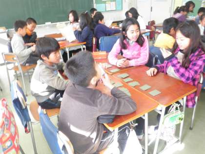 4年2組は日本語の学習で班ごとに百人一首を覚えていました。
