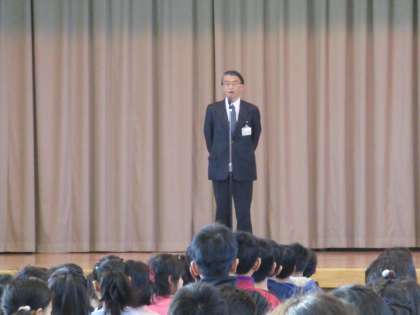 終業式が体育館で行われました。校長先生から3つお話がありました。まず、今日は2学期の最後の日なので、自分と友達のがんばったこと、よかったことをぜひほめてくださいという話でした。次に、学校で取り組んでいる「めあて学習」「あいさつ」「運動」について、そして最後に冬休みの生活についてお話がありました。