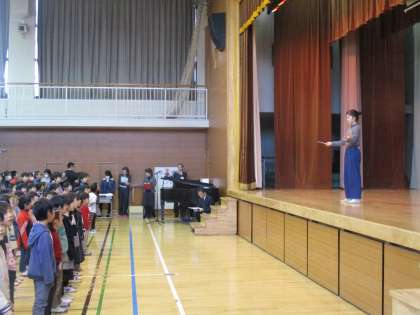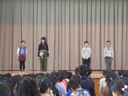 2年生と5年生の代表4人が2学期にがんばったことを一人ずつ舞台の上で発表しました。全校から温かい拍手が送られていました。そして、最後に校歌を歌いました。