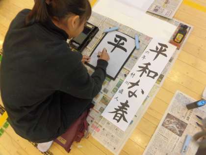 しかし、子どもたちはよく集中しており、新年の決意を込めて「平和な春」と書きました。